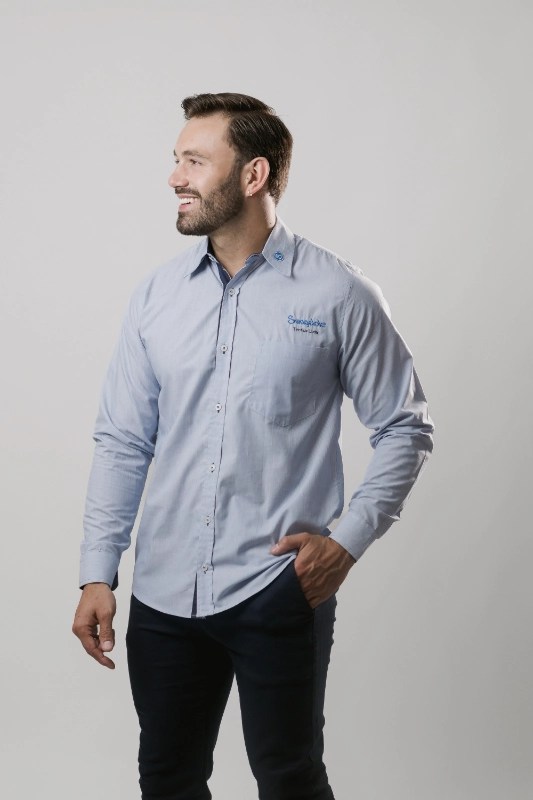 Camisa Jeans masculina, apresenta colarinho clássico, fechamento frontal com abotoamento duplo e mangas longas.