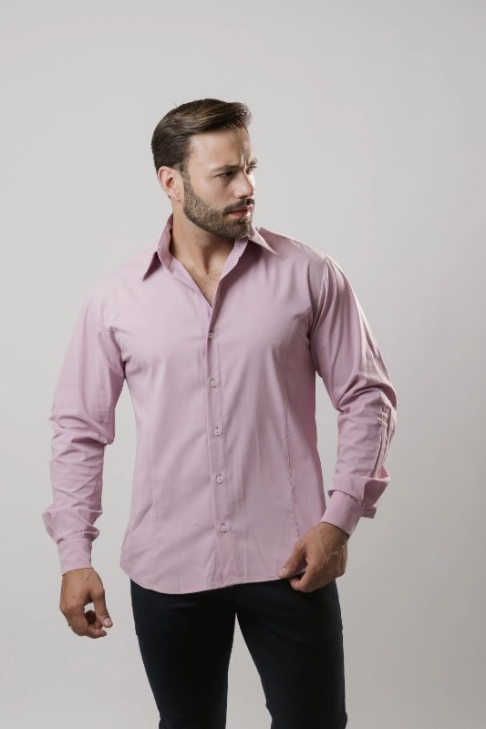 Camisa social masculina apresenta colarinho clássico, fechamento frontal com botões e mangas longas.